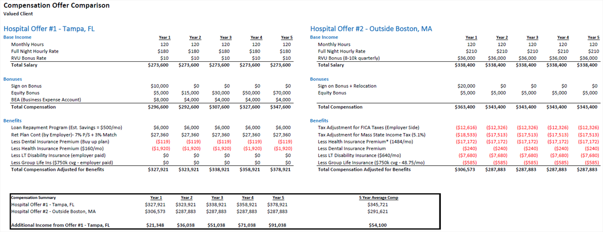 A client is considering competing ER physician offers in different cities. Assuming the client likes both locations, which is a better offer?